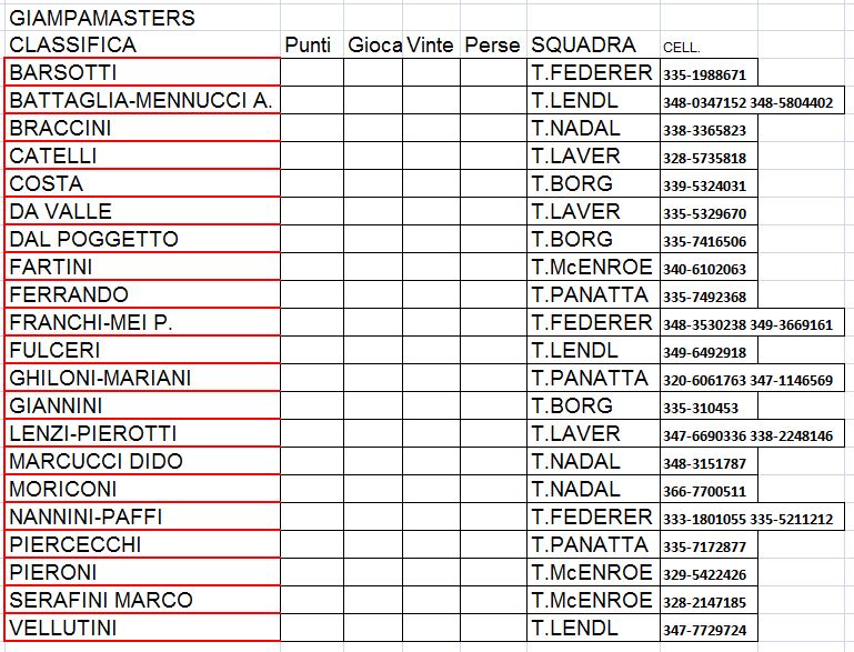 I PARTECIPANTI AL MASTERS, SARANNO RAGGRUPPATI IN SQUADRE DA 3 ELEMENTI , E CONCORRERANNO ANCHE PER LA VITTORIA DEL TORNEO A SQUADRE GIAMPADAVIS.